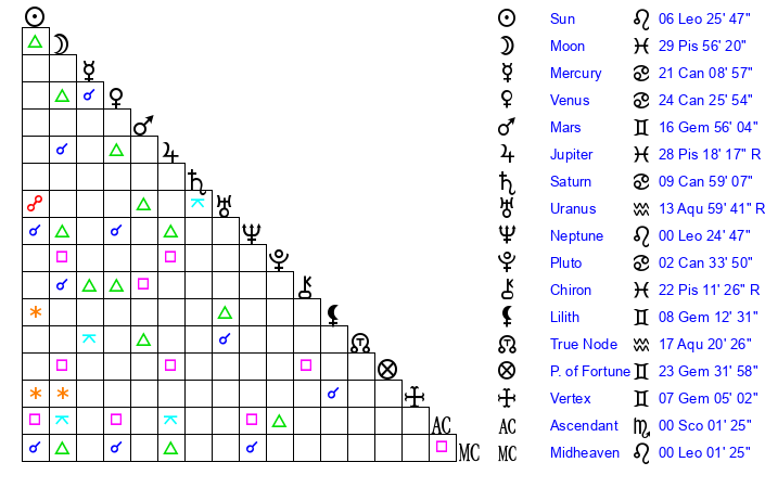 | Neptune | 0 Leo 25 | 1 Aries 59 | 2 Leo 38 |