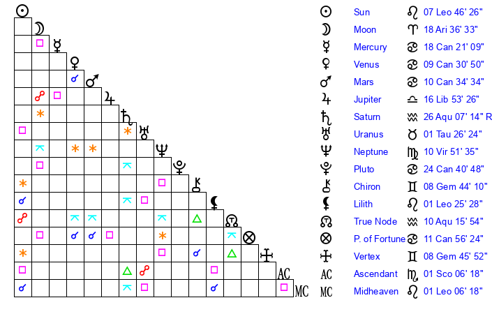 | Moon | 18 Aries 41 | 29 Libra 51 | 10 Leo 30 |