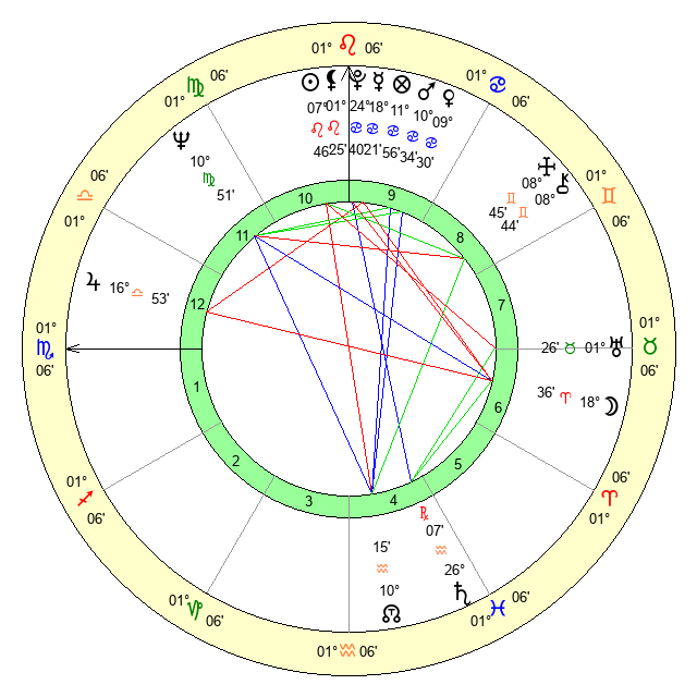 | Sun | 7 Leo 46 | 8 Leo 44 | 6 Scorpio 35 |
