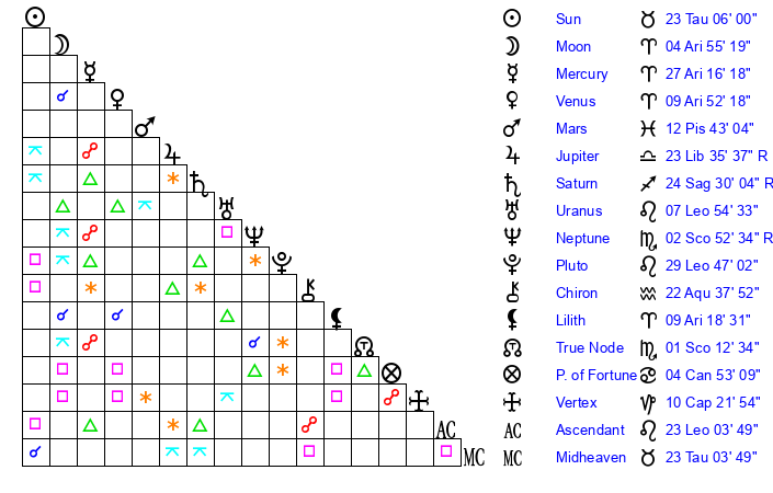 | Mercury | 27 Aries 16 | 6 Taurus 50 | 23 Leo 21 |