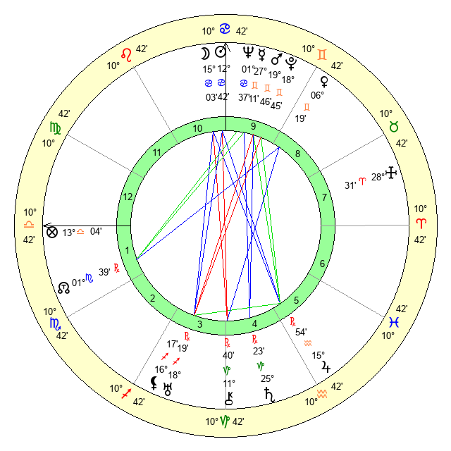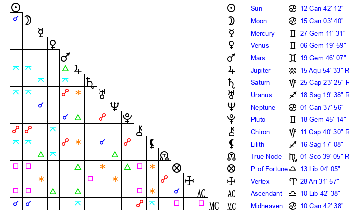 | Moon | 15 Cancer 6 | 15 Scorpio 30 | 11 Capricorn 32 |