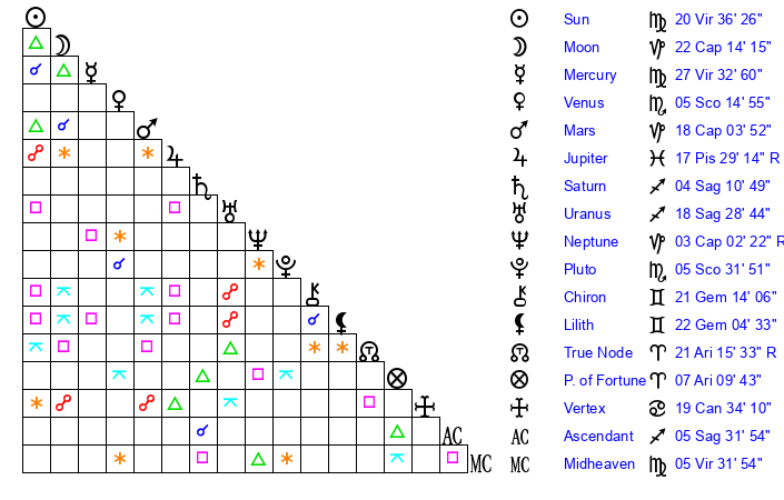 Sun | 20 Virgo 36 | 21 Virgo 9 | 29 Libra 0 |