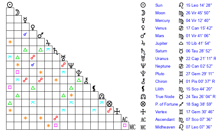 Moon | 26 Virgo 51 | 8 Aquarius 41 | 6 Sagittarius 47 |
