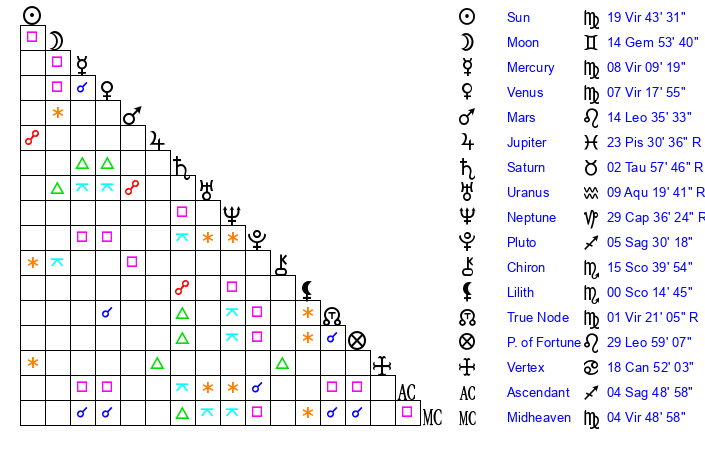 | Sun | 19 Virgo 44 | 20 Virgo 11 | 16 Libra 12 |
