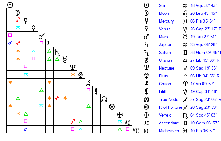 | Sun | 18 Aquarius 32 | 19 Aquarius 10 | 9 Aries 36 |