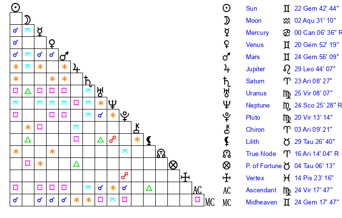 Sun | 22 Gemini 43 | 22 Gemini 56 | 17 Leo 8 |