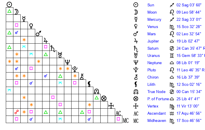| Moon | 9 Leo 56 | 21 Virgo 2 | 25 Gemini 29 |
