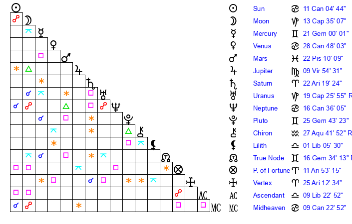 | Moon | 13 Capricorn 40 | 21 Libra 52 | 16 Aries 24 |