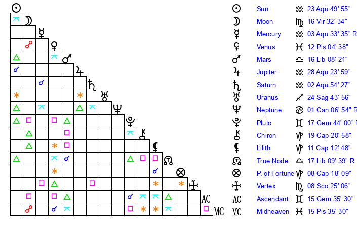 | Sun | 23 Aquarius 50 | 25 Aquarius 15 | 23 Gemini 23 |
