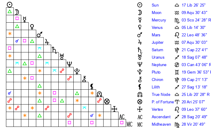 | Sun | 17 Libra 26 | 18 Libra 38 | 21 Aquarius 49 |