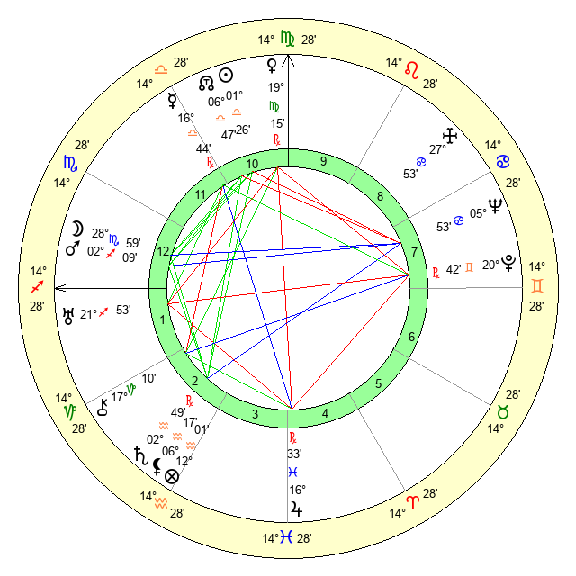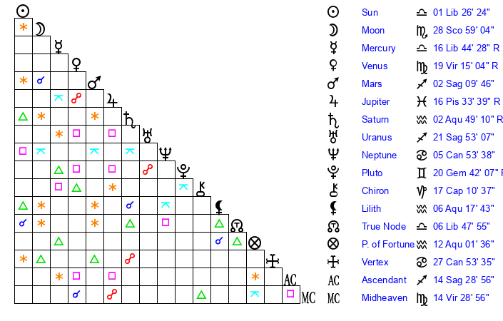 | Venus | 19 Virgo 14 | 7 Virgo 34 | 24 Sagittarius 22 |