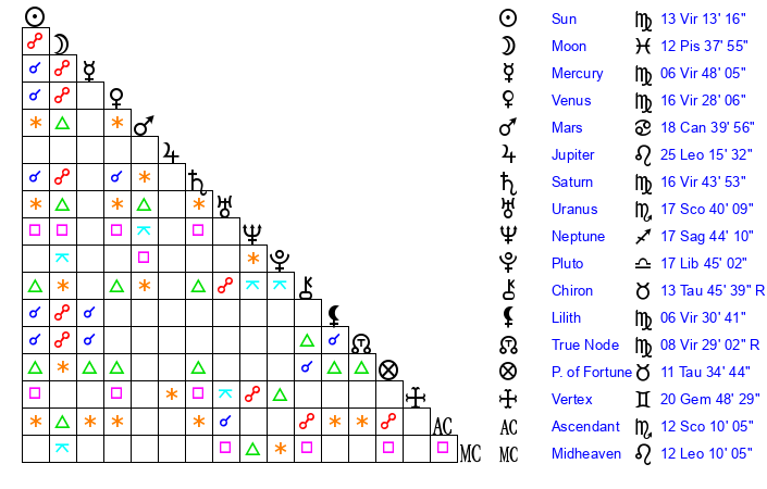 | Saturn | 17 Virgo 5 | 29 Pisces 31 | 22 Virgo 38 |