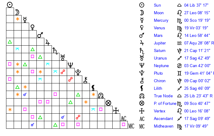 | Moon | 27 Leo 2 | 21 Sagittarius 31 | 19 Aquarius 56 |
