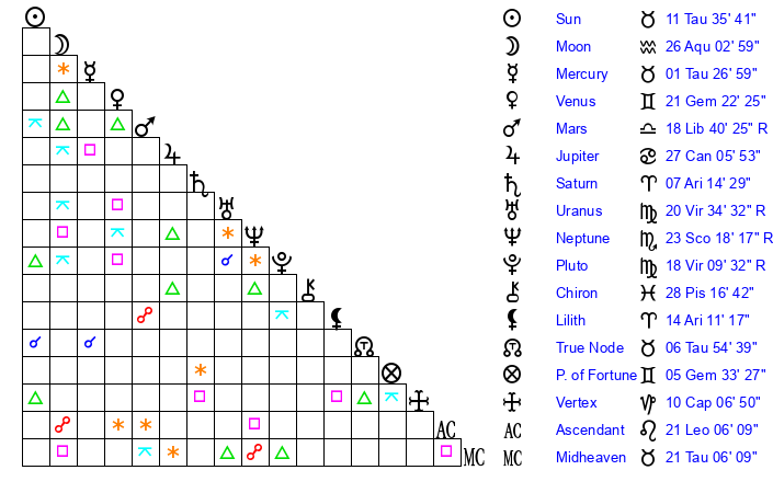 | Moon | 26 Aquarius 4 | 19 Cancer 42 | 6 Aries 31 |