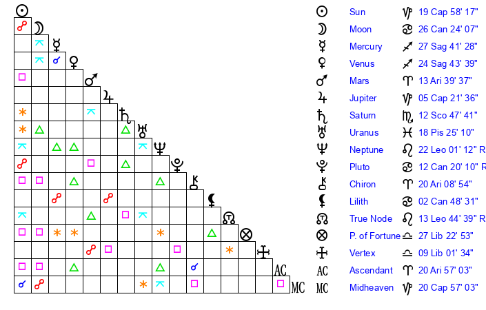Sun | 19 Capricorn 58 | 20 Capricorn 42 | 0 Taurus 5 |