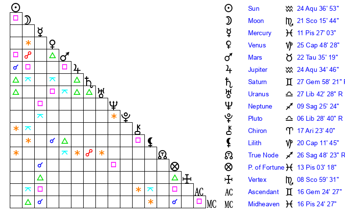 | Sun | 24 Aquarius 37 | 25 Aquarius 15 | 15 Aries 31 |