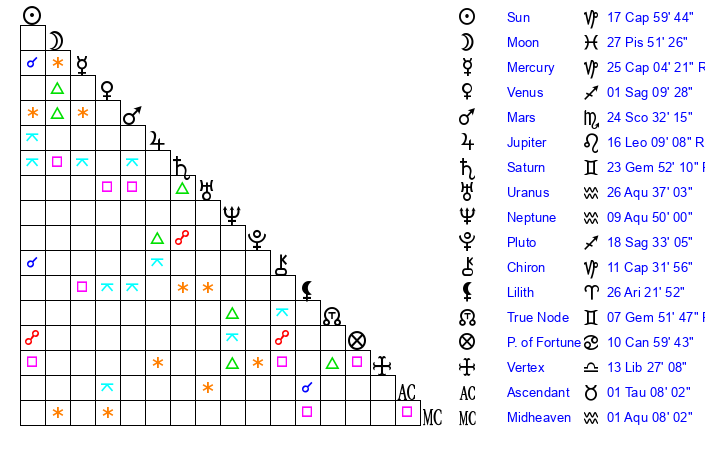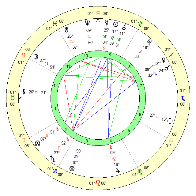 | Neptune | 9 Aquarius 50 | 27 Pisces 25 | 10 Aquarius 39 |