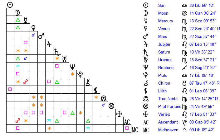 | Sun | 28 Libra 56 | 29 Libra 33 | 16 Sagittarius 15 |