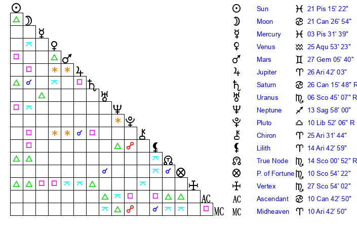 | Sun | 21 Pisces 15 | 21 Pisces 22 | 9 Taurus 29 |