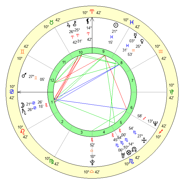 | Moon | 21 Cancer 25 | 22 Leo 9 | 12 Taurus 32 |
