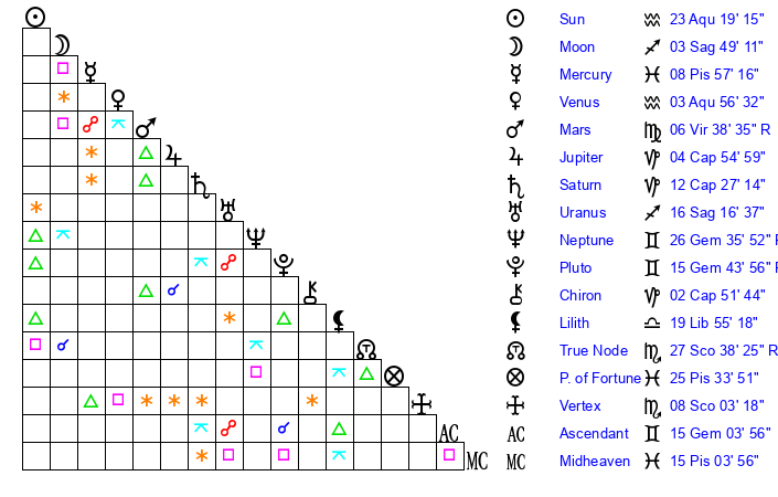 | Saturn | 12 Capricorn 56 | 18 Pisces 40 | 15 Capricorn 1 |