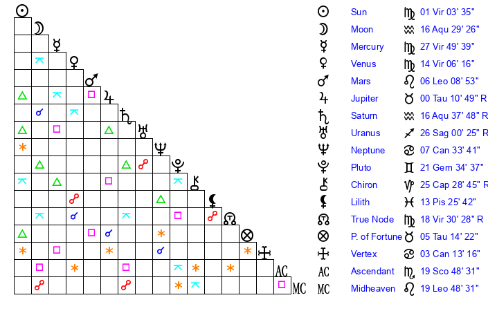 | Moon | 16 Aquarius 27 | 18 Virgo 54 | 13 Cancer 34 |