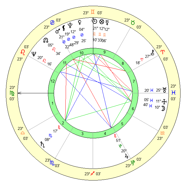 | Sun | 21 Gemini 11 | 21 Gemini 58 | 27 Virgo 12 |