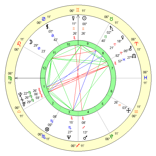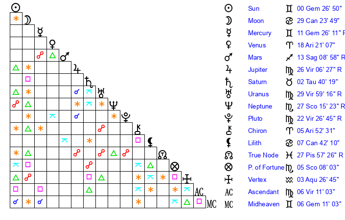| Sun | 0 Gemini 27 | 0 Gemini 53 | 23 Cancer 58 |