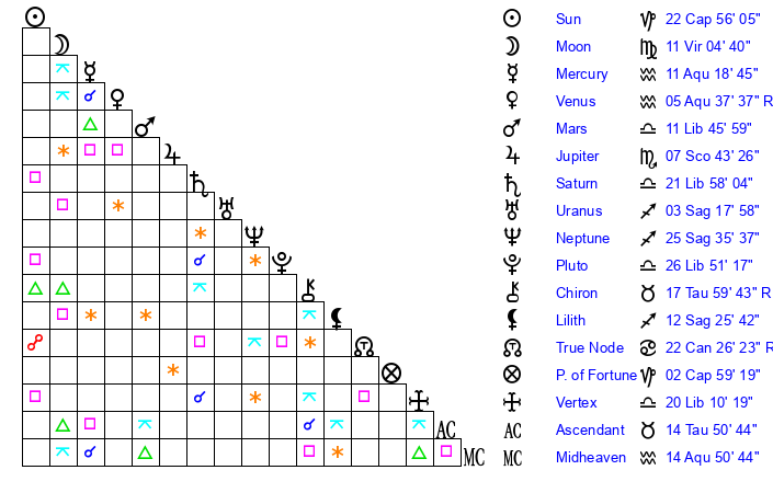 | Venus | 5 Aquarius 38 | 10 Pisces 38 | 27 Capricorn 13 |