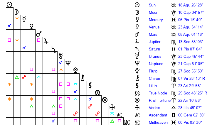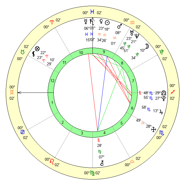 Venus | 23 Aquarius 34 | 2 Aries 13 | 2 Aries 19 |