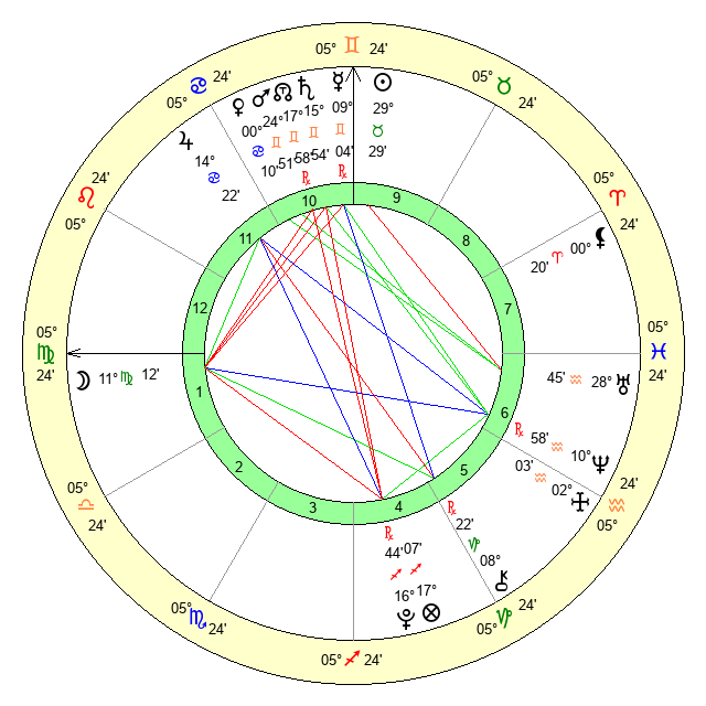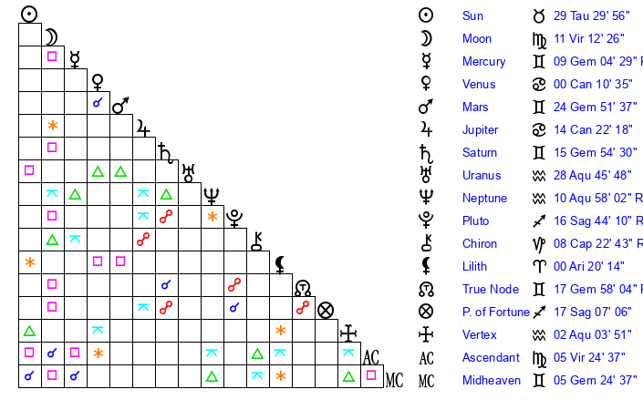 | Moon | 11 Virgo 17 | 2 Pisces 27 | 12 Cancer 46 |