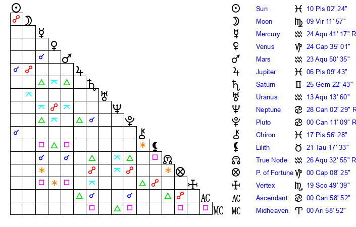 | Moon | 9 Virgo 13 | 4 Aries 18 | 16 Virgo 13 |