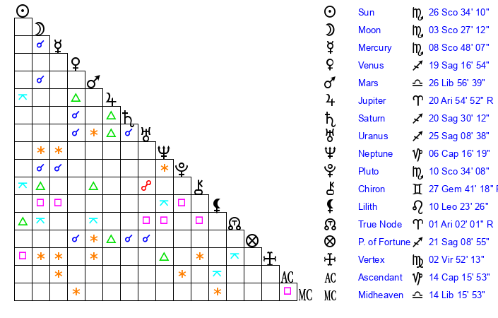 Sun | 26 Scorpio 34 | 27 Scorpio 36 | 4 Capricorn 8 |