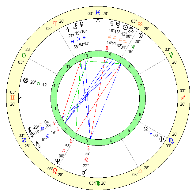 | Sun | 12 Aquarius 32 | 14 Aquarius 6 | 0 Gemini 16 |