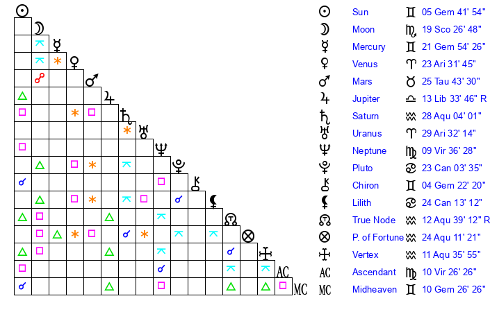| Moon | 19 Scorpio 24 | 14 Gemini 53 | 28 Pisces 56 |