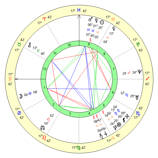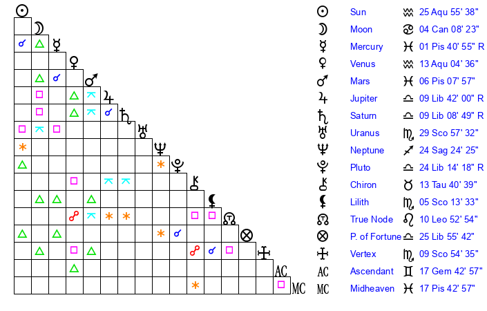 | Moon | 4 Cancer 12 | 20 Virgo 25 | 1 Aquarius 54 |