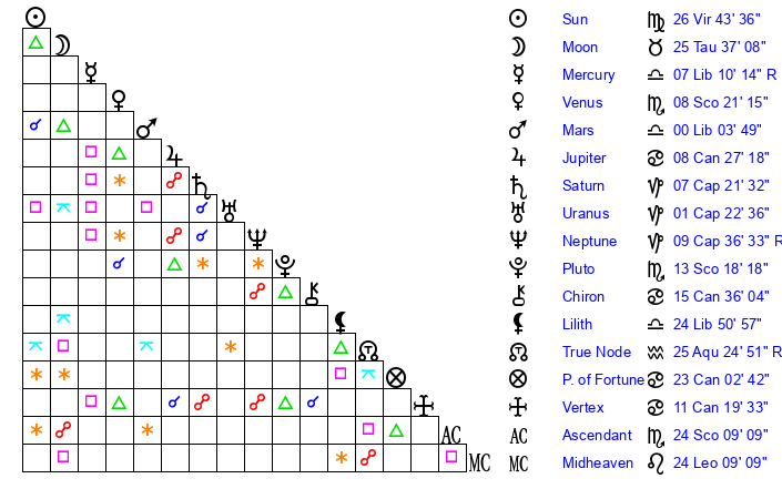 Moon | 25 Taurus 27 | 2 Virgo 17 | 19 Virgo 26 |