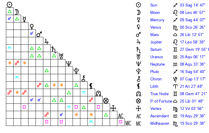 Pluto | 16 Sagittarius 55 | 0 Aquarius 6 | 17 Sagittarius 46 |