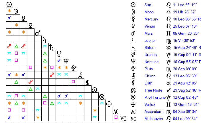 | Mercury | 10 Leo 8 | 7 Leo 4 | 4 Virgo 31 |