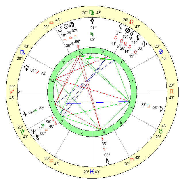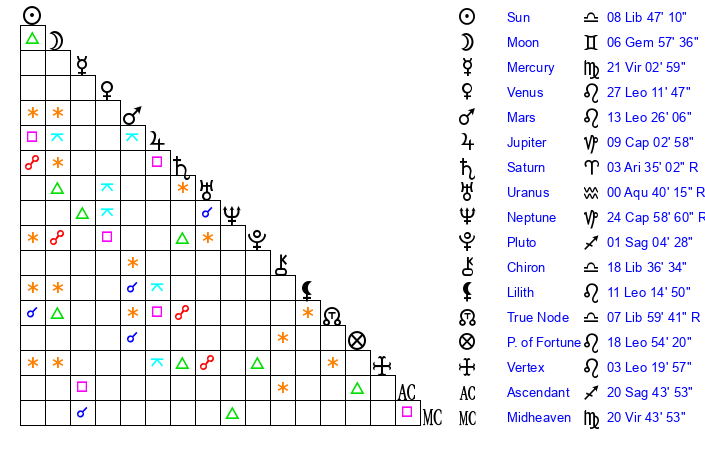 Venus | 27 Leo 12 | 14 Virgo 56 | 1 Libra 28 |