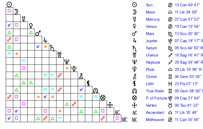| Mercury | 27 Cancer 58 | 9 Leo 47 | 13 Virgo 22 |