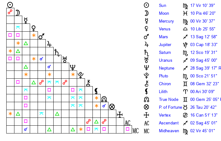 | Moon | 10 Pisces 44 | 13 Aries 24 | 4 Virgo 16 |