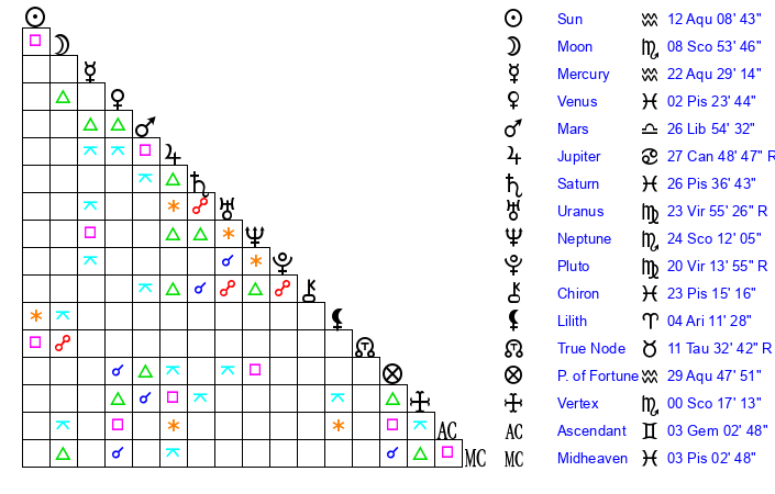 | Sun | 12 Aquarius 9 | 13 Aquarius 5 | 10 Aries 17 |