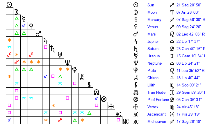 | Neptune | 8 Libra 25 | 27 Pisces 8 | 7 Libra 56 |