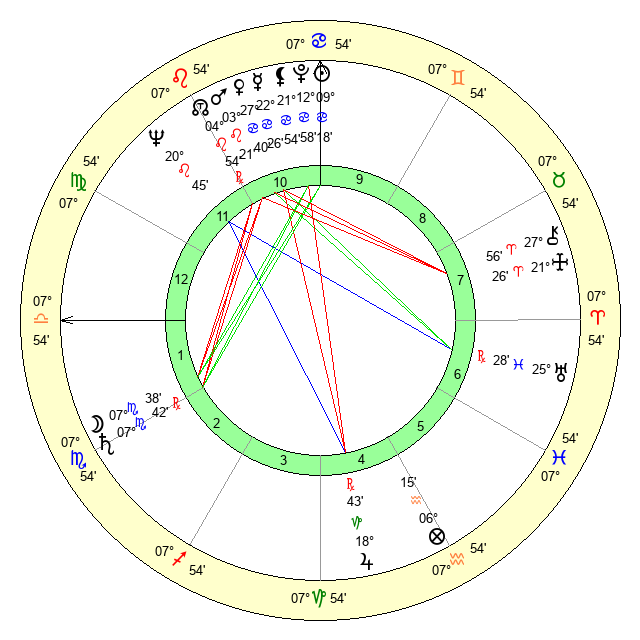 | Moon | 7 Scorpio 32 | 27 Virgo 56 | 15 Cancer 16 |