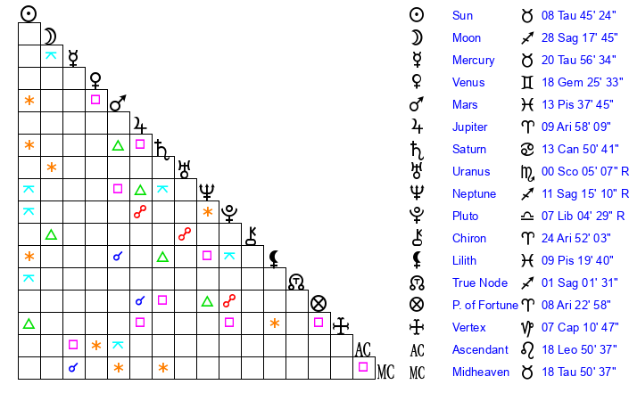 | Sun | 8 Taurus 45 | 9 Taurus 38 | 26 Gemini 50 |