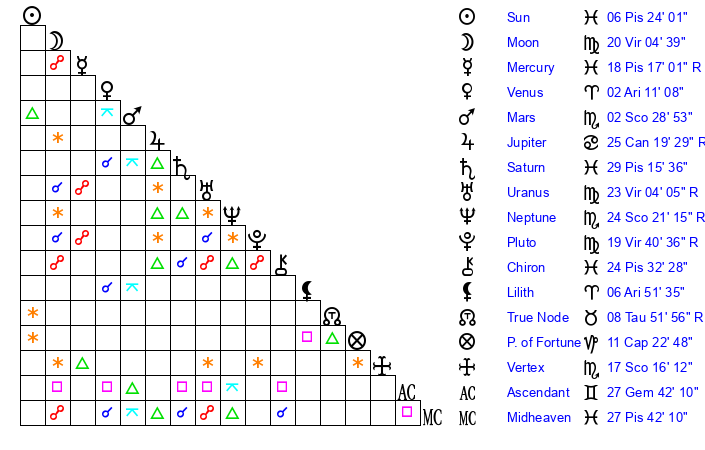| Sun | 6 Pisces 24 | 7 Pisces 20 | 3 Taurus 49 |