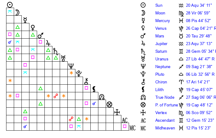 | Sun | 20 Aquarius 34 | 21 Aquarius 12 | 11 Aries 35 |