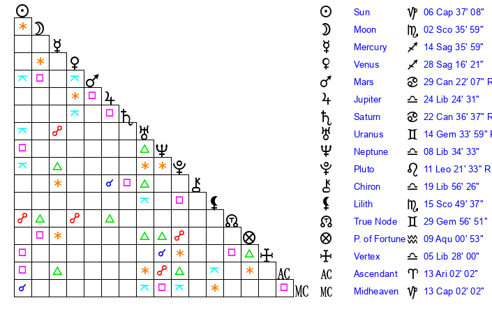 | Moon | 2 Scorpio 37 | 10 Sagittarius 59 | 25 Virgo 21 |