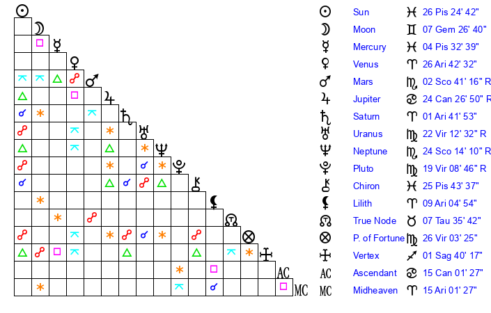 | Sun | 26 Pisces 25 | 27 Pisces 21 | 23 Taurus 12 |